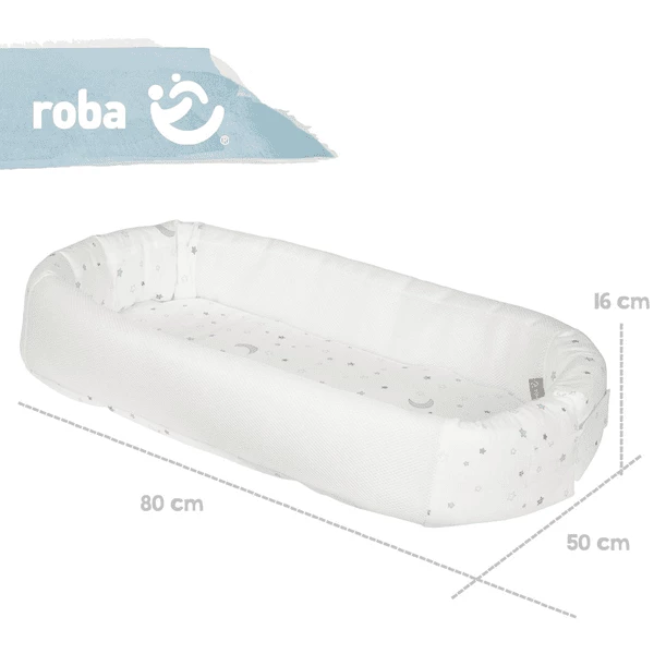 De bundel roba “Sternenzauber” bestaat uit een aan 2 zijden genaaide jersey deken en een baby lounge met sterrenpatroon.De roba babydeken “Sternenzauber” van 100 % katoen jersey is de perfecte metgezel voor onderweg en thuis. Het is knuffelzacht en geschikt als kinderwagen-, kruip-, speel- en knuffeldeken. De liefdevol ontworpen sterrenmagie Design past discreet in elke kinder- en babykamer. De knuffelbare roba babydeken voor meisjes en jongens is een liefdevol cadeau voor de geboorte. Het praktische, zorgvuldig vervaardigde babydekentje is tweezijdig genaaid en daardoor duurzaam en vormvast. De babydeken van 100% katoenen jersey meet 80×80 cm en is wasbaar op 40 °C en geschikt voor de droogtrommel.De roba baby lounge is een praktische metgezel wanneer u met uw baby op stap bent. In het zacht gevoerde roba knuffelnest voelt uw baby zich veilig en rondom comfortabel. De hoogwaardige netinzetten aan de lange zijden van het nest zijn gemaakt van bijzonder luchtdoorlatend, ademend netmateriaal, dat CO2-rebreathing vermindert en een optimale luchttoevoer mogelijk maakt, waardoor het risico van oververhitting minimaal is. De opstaande rand van het knuffelnest zorgt voor veiligheid en kan in het onderste gedeelte worden geopend en gesloten door middel van een klittenbandsluiting. Het knuffelnest is geschikt als aankleedkussen, knuffelbed op de bank, reisbedje voor onderweg en als zacht kussen op de vloer. De babylounge is gemaakt van bijzonder zacht, ge peach tem jersey van 100% katoen. De vulling van polyester fleece van het ligvlak van het babynestje kan voor het wassen (30 °C) met een rits worden verwijderd. Geschikt voor kinderen van 0 tot 6 maanden.Alle gebruikte materialen zijn getest op schadelijke stoffen, gecertificeerd en regelmatig getest.