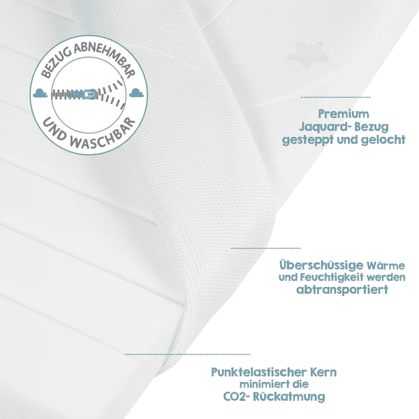 roba Het wiegmatras AIR BALANCE PLUS safe asleep®, met ademend 3D-materiaal, zorgt voor een optimaal slaapklimaat voor uw baby. Een puntelastisch en luchtcirculerend wiegmatras draagt bij tot de veiligheid in het babybed. Omdat baby’s zachte botten hebben, mag de matras niet te hard zijn. De safe asleep® matrassen zijn net stevig genoeg, zodat er geen holtes ontstaan waarin uw kind te diep kan wegzakken. Alle safe asleep® matrassen zijn uitgerust met het AIR- balance systeem, dat werkt als een natuurlijk airconditioningsysteem. Verticaal ontworpen groeven en gaten in het wiegmatras minimaliseren de CO2-rebreathing en voeren overtollige warmte en vocht af, waardoor ongezonde warmteontwikkeling wordt voorkomen. De matras is gemaakt van ademend materiaal met 3D-structuur, wat zorgt voor een optimale luchtcirculatie en een gezond, comfortabel klimaat waarin uw baby vrij kan ademen en niet zweet. De afneembare, gewatteerde en geperforeerde jacquard hoes is wasbaar op 30° C en geschikt voor de droogtrommel. De safe asleep® matrassen werden ontwikkeld in samenwerking met artsen en vroedvrouwen en zijn ook zeer geschikt voor mensen met een allergie. Alle safe asleep® matrassen zijn ontwikkeld volgens de huidige DIN EN 16890 norm en zijn getest op schadelijke stoffen volgens Öko-Tex® Standard 100 en LGA.
